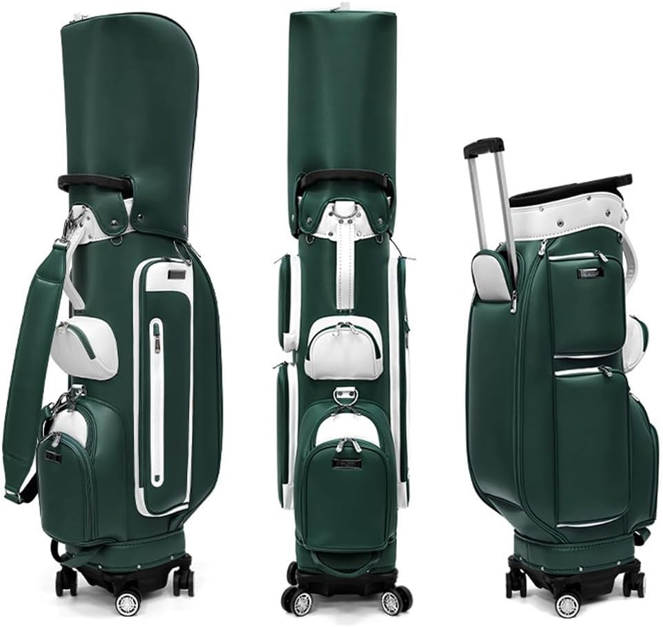New Women Golf Bag Hidden Lever Ball Bag Waterproof Microfiber 4 Wheels Can Be Pushed/Towed HorizontallyFeatures:- The hidden lever can be pulled out freely and is easy to drag.- Universal four-wheel design, quiet and wear-resistant, can be pushed horizontally and towed- Waterproof microfiber leather, you can play ball after traveling without fear of changing weather- Large capacity with pole insertion hole, easily store a full set of golf clubs-Multifunctional storage bag for easy useParameter:Name: Golf tugboat bagColor: Brown/GreenNet weight: about 4.3kgMaterial: waterproof microfiber leatherProduct size: height 126cm, width 36cmPacking list: 1* Golf Tug BagNOTE: Golf clubs are not included in the package list