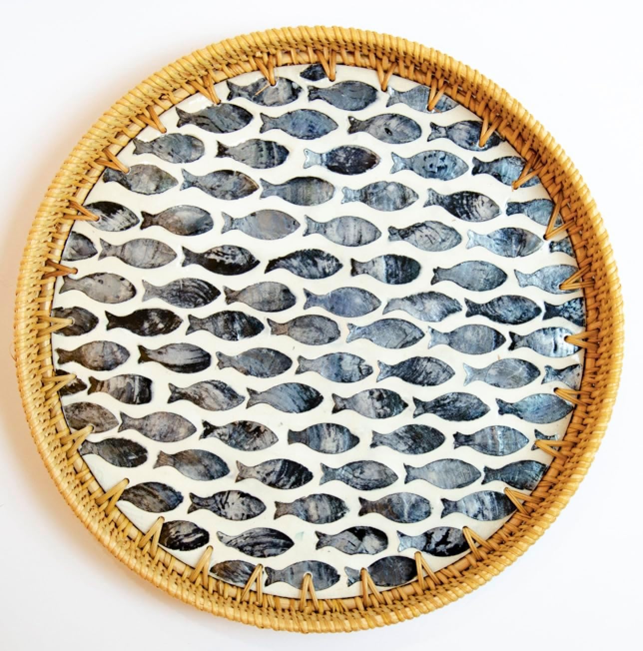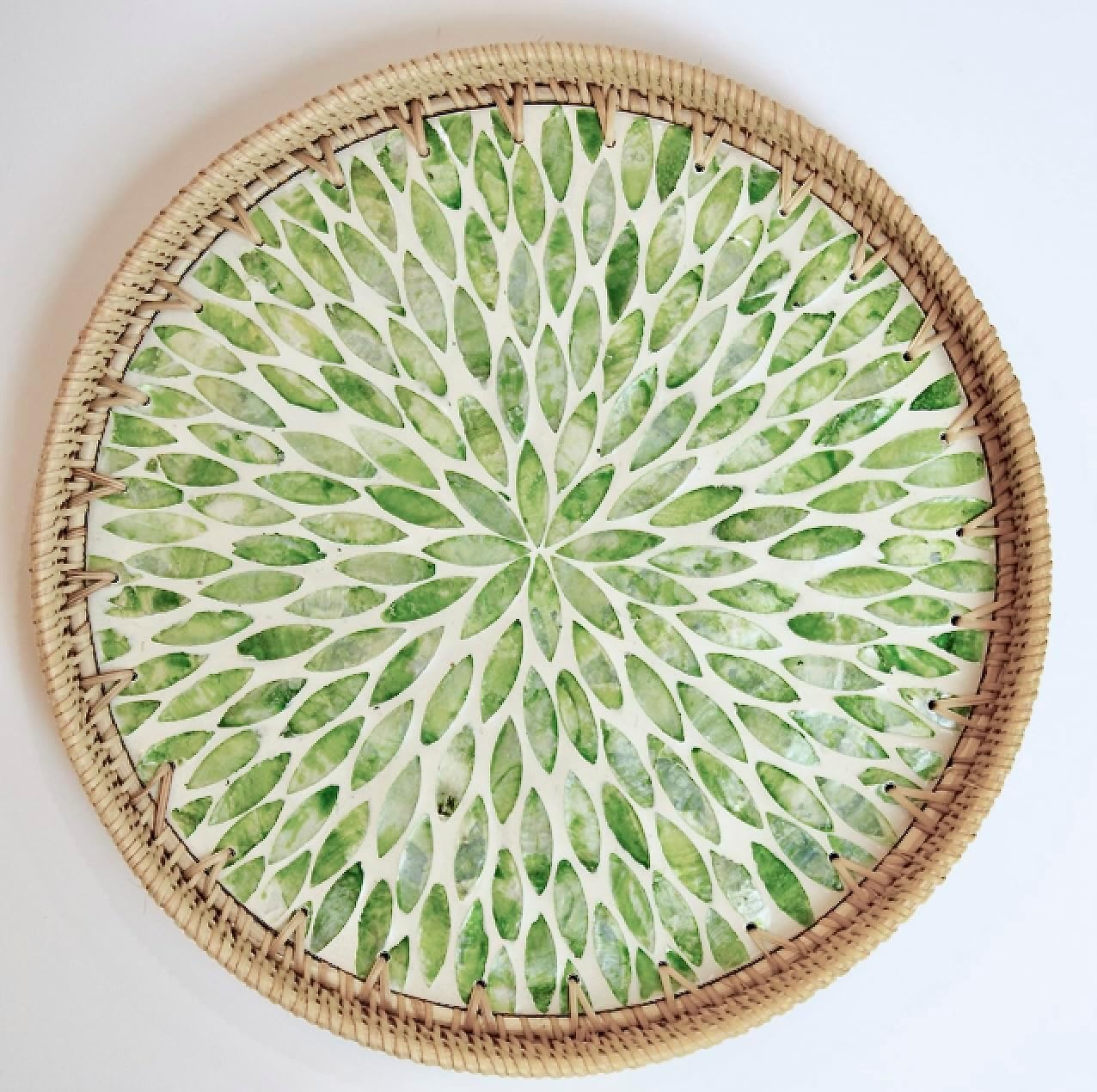 Elevate your home decor with this exquisite 12-inch round rattan tray, featuring a stunning mother of pearl inlay that adds a touch of elegance to any space. Perfect for both functional use and decorative display, this versatile wicker tray seamlessly blends farmhouse charm with contemporary style. The intricate weaving creates a durable yet sophisticated serving surface ideal for displaying fruits, arranging coffee essentials, or presenting appetizers at your next gathering. Whether placed on your coffee table as a decorative centerpiece or used for serving guests, this tray makes a statement in any room. Its neutral tones and classic design complement various home decor styles, making it an excellent choice for both everyday use and special occasions. The tray's thoughtful size is perfect for manageable serving while maintaining an impressive presence. It also makes a wonderful housewarming or holiday gift for those who appreciate both beauty and functionality in their home accessories.