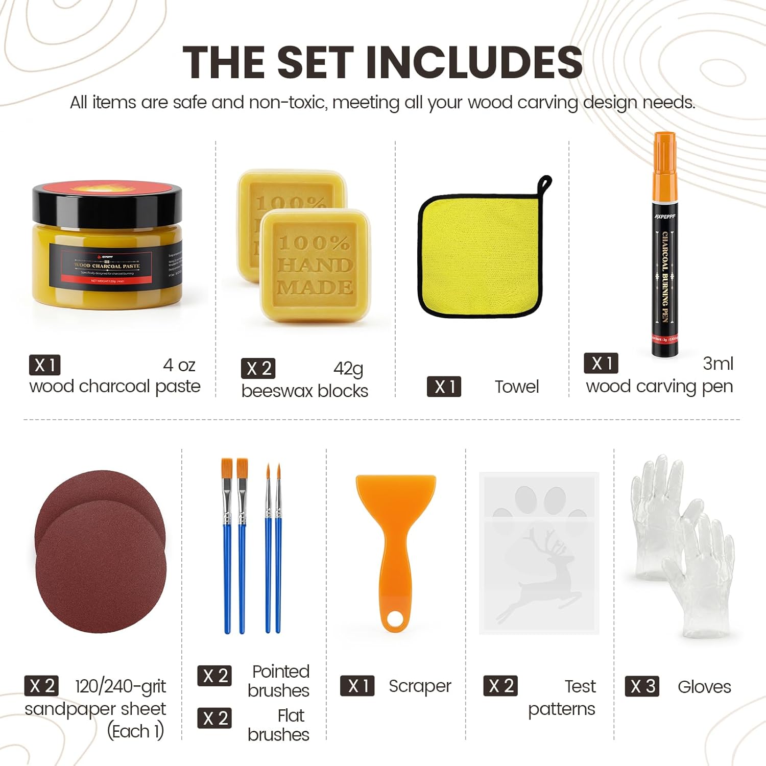WOOD BURN PASTE PEN KIT:1 x 3ml wood carving pen, 4oz wood charcoal paste, 1 x scraper, 2 x pointed brushes, 2 x flat brushes, 1 x 240-grit sandpaper, 1 x 120-grit sandpaper, 1 x instruction manual, 2 x 42g beeswax blocks, 1 x towel, 3 x pairs of clear gloves, 2 x test patterns. All items are safe and non-toxic, meeting all your wood carving design needs